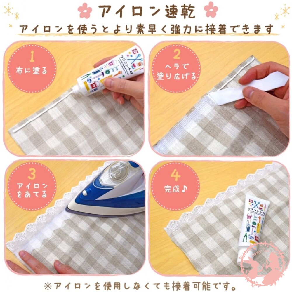 黏膠塗在布料上,再用熨斗燙平,即可輕鬆黏著,