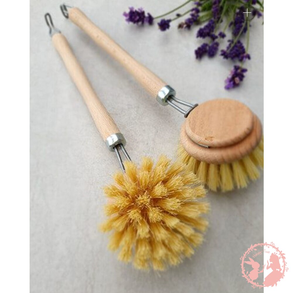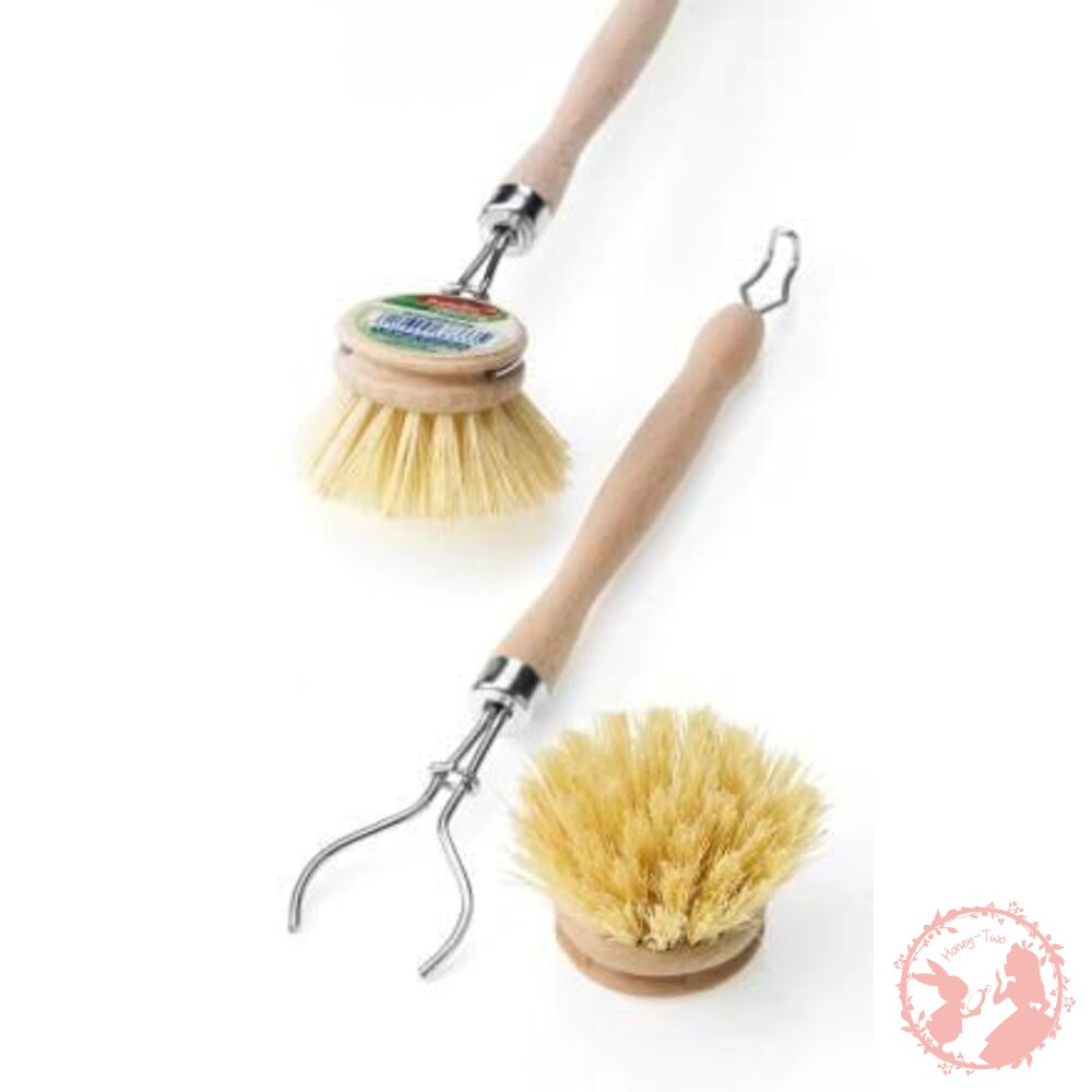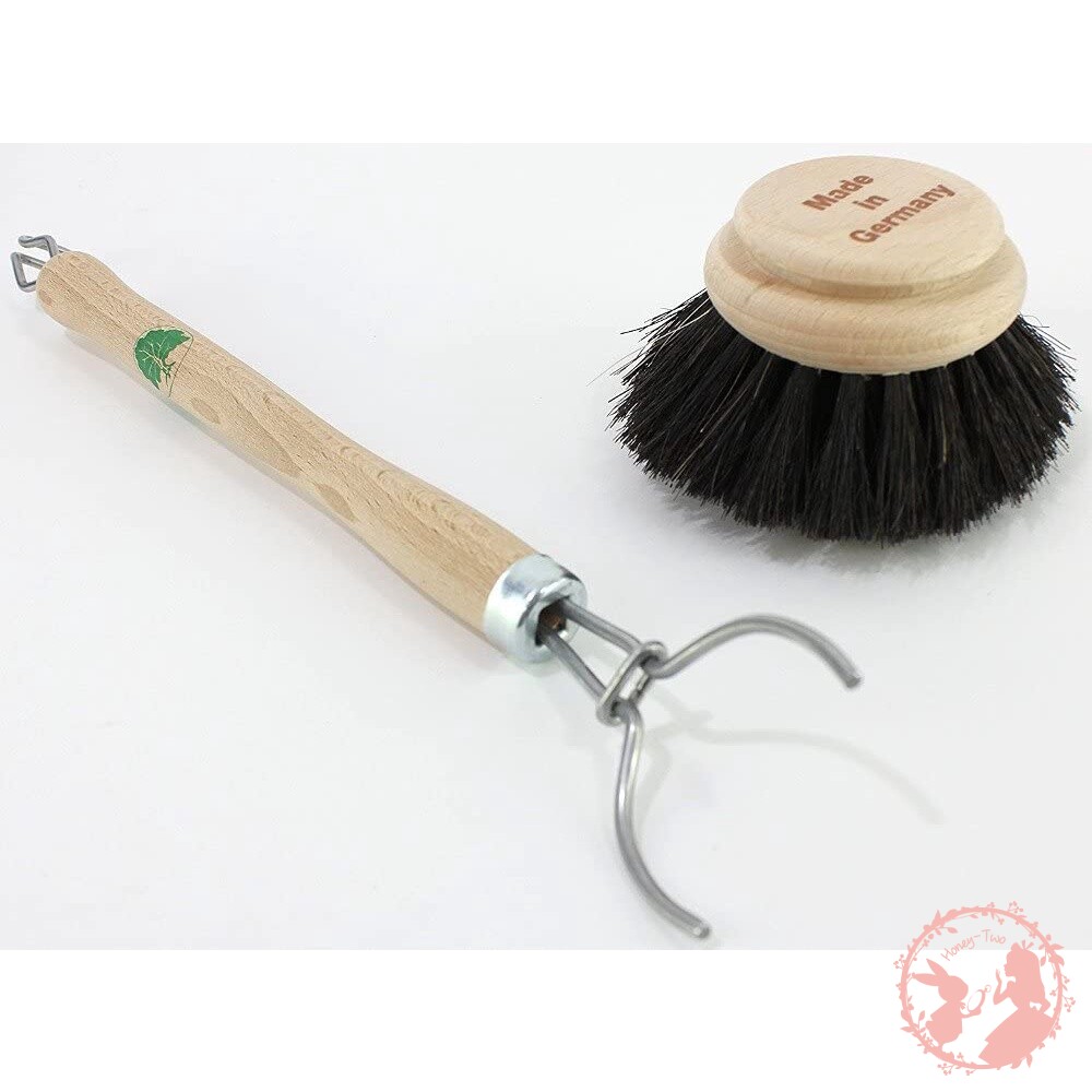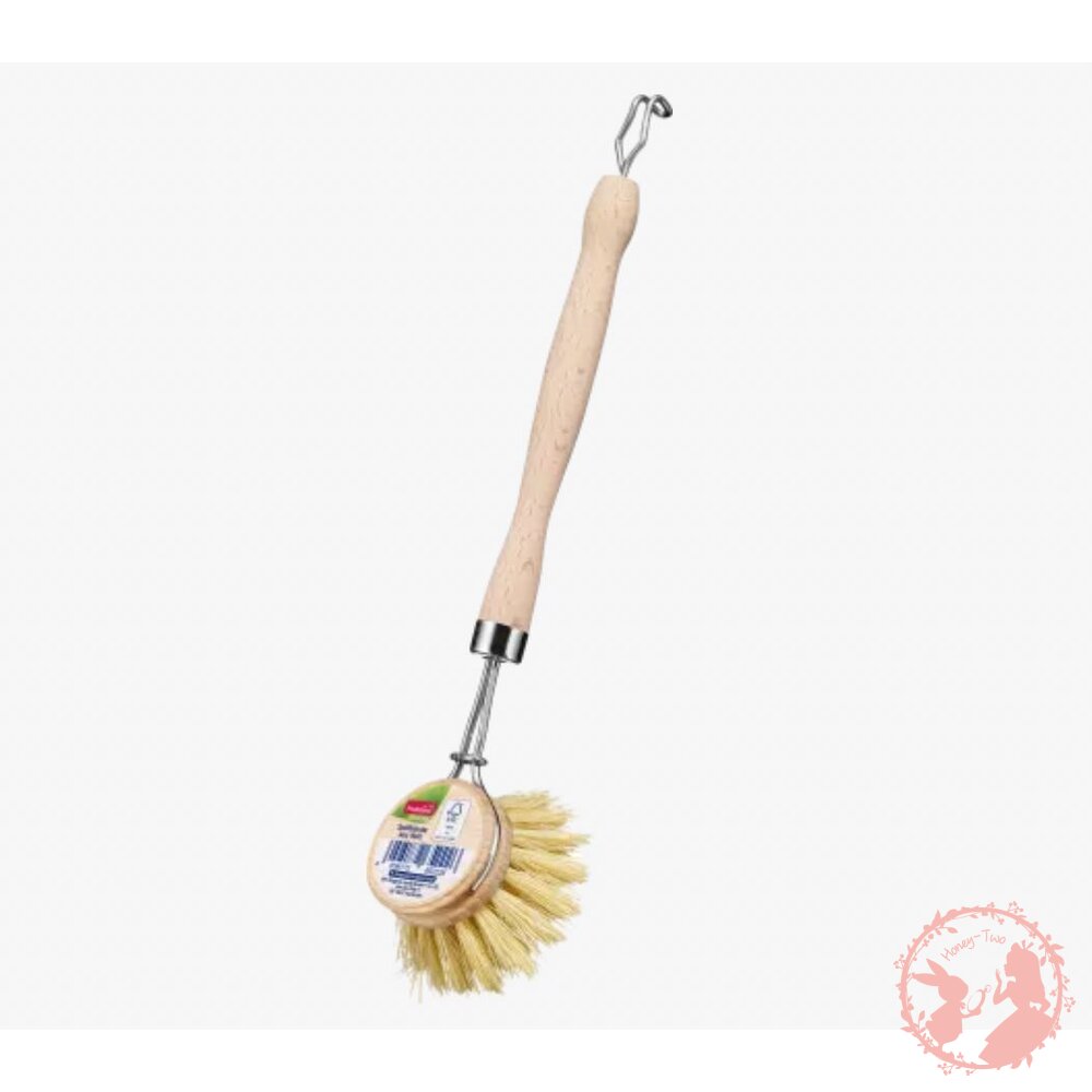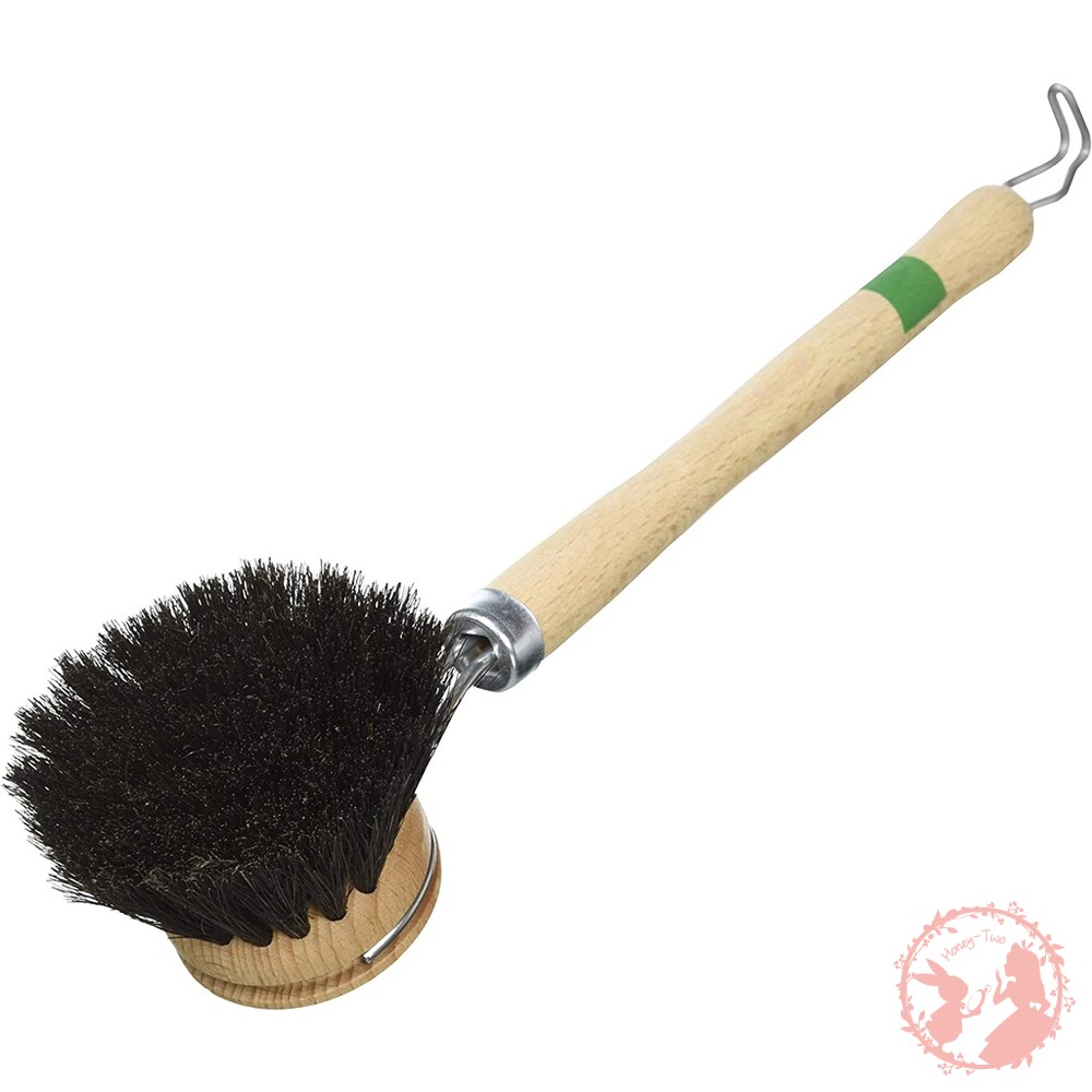 此款洗碗刷的手柄為100%歐洲木材製作,刷毛是具有植物性的剛毛,刷頭可拆卸使用,手柄頂端有懸掛吊勾方便收納