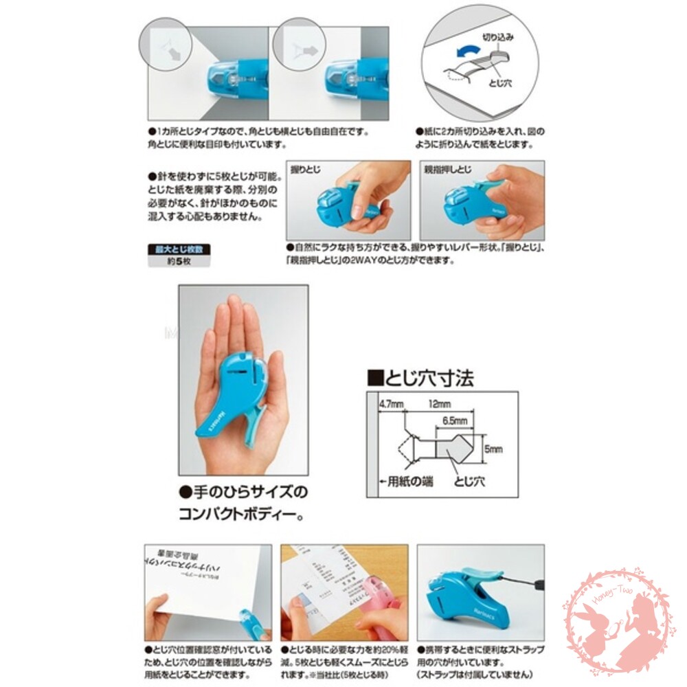 小巧桌上隨身型 握手一側有小孔可以掛掛繩 最多可訂5張一般影印紙那種 釘紙孔徑為:約5mm×6.5mm (※注意這款無針訂書機會在紙上打個洞)) 規格:SLN-MSH305 27mm×87mm×H53mm 藍、黑(偏藍)、綠、粉、白 材質: 本體-鋼鐵 外殼:再生ABS 刀刃:不銹鋼 來源:日本